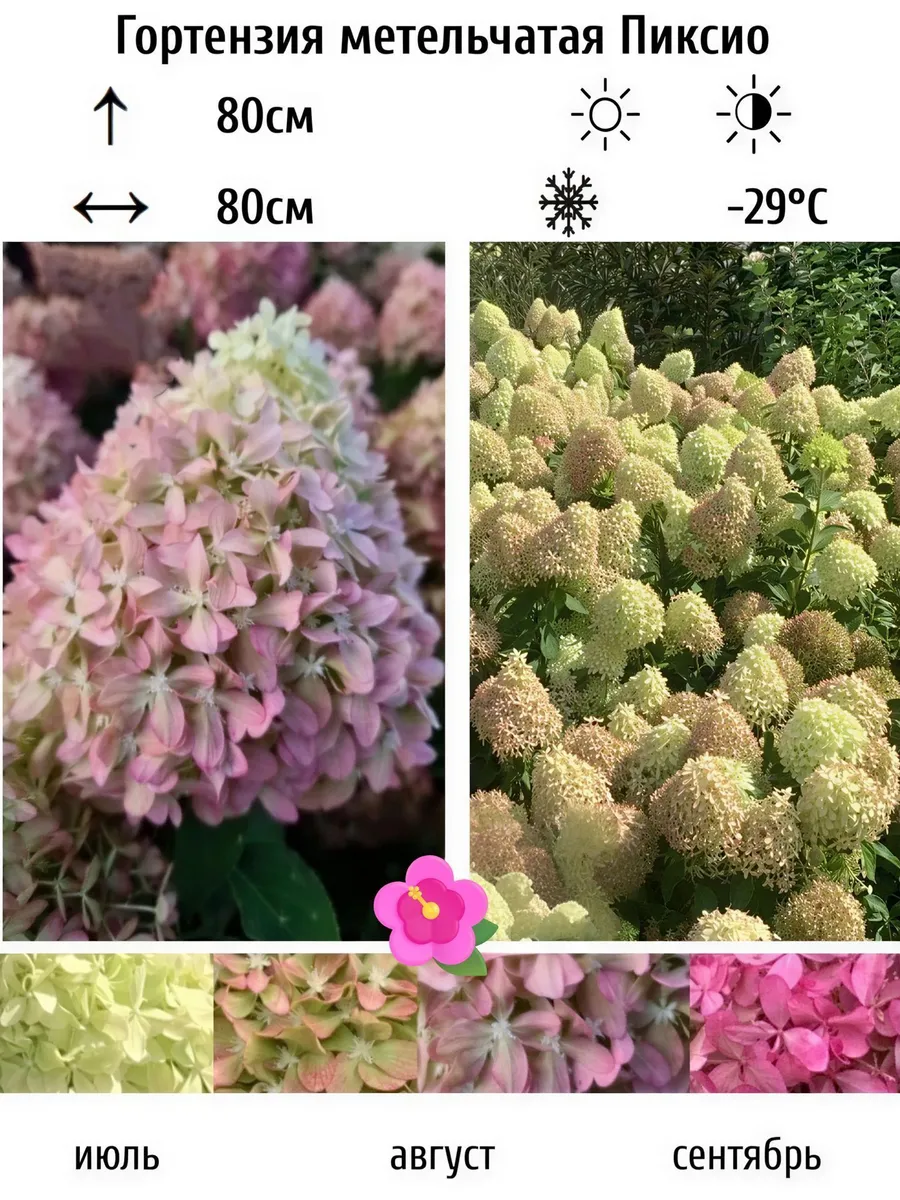 Гортензия метельчатая (Hydrangea paniculata) один из самых популярных садовых кустарников, который ценится за обильное и продолжительное цветение, а также неприхотливость в уходе. Длительное цветение: куст украшен цветами всё лето и осень. Изменение окраски: соцветия меняют цвет в течение сезона от белого/кремового до розового, малинового или даже красного. Неприхотливость: не требует сложного ухода, хорошо переносит морозы и городские условия. Универсальность: подходит для живых изгородей, бордюров, одиночных и групповых посадок, а также для контейнерного выращивания. Быстрый рост: зацветает на 23-й год после посадки. Саженцы есть в наличии в р9,1л,3л,5л,10л контейнер.